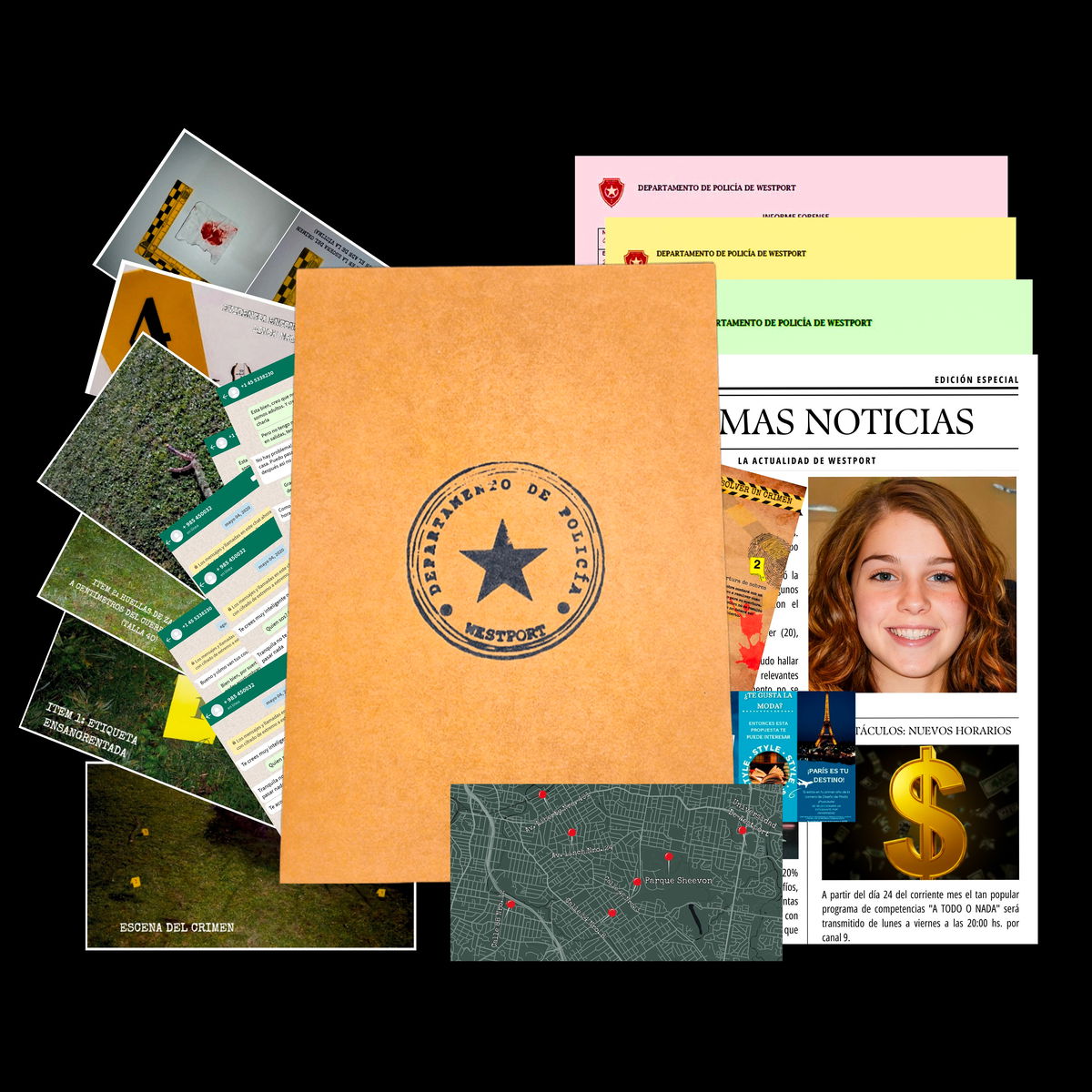 | Las imágenes proporcionadas del producto no representan la totalidad de la documentación del caso. El juego contiene más archivos e ítems, que solo podrá visualizar cuando posea los expedientes en sus manos, garantizando asi, una experiencia de investigación completa |